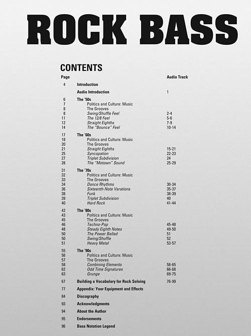 Foreword by Billy Sheehan Learn the essential rock grooves and bass lines in the styles of Paul McCartney, John Entwistle, John Paul Jones, Geddy Lee, Sting, Billy Sheehan, Flea, and many more! This completely revised edition will teach you the bassics of shuffle, straight eighth, the bounce feel, the Motown sound, funk, hard rock, techno-pop, power ballad, heavy metal, alternative, grunge, odd time signatures, dance rhythms, and more. It also includes an extensive overview of equipment, effects and essential listening suggestions. The CD includes 99 full-demo tracks and 131 music examples.