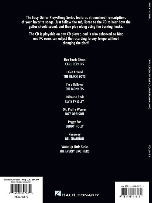 The Easy Guitar Play-Along® Series features streamlined transcriptions of your favorite songs. Just follow the tab, listen to the CD to hear how the guitar should sound, and then play along using the backing tracks. The CD is playable on any CD player, and is also enhanced to include the Amazing Slowdowner technology so MAC and PC users can adjust the recording to any tempo without changing the pitch! Volume 4 features 8 songs: Blue Suede Shoes · I Get Around · I'm a Believer · Jailhouse Rock · Oh, Pretty Woman · Peggy Sue · Runaway · Wake Up Little Susie.