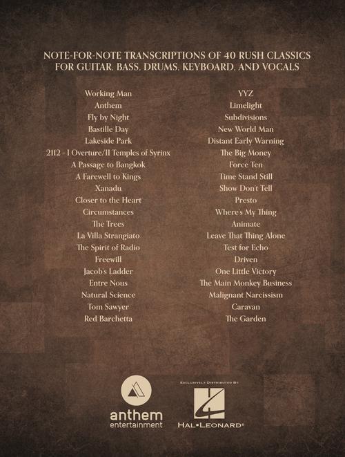 Few bands have built as dedicated following as Rush did in their over 40 years together. These Rock and Roll Hall of Fame inductees were some of the most influential, innovative, and talented musicians this world has ever seen. Our deluxe set pays tribute to their legacy for all fans and musicians to treasure for years to come. This hardcover collection features full transcriptions of every instrument, every note, every lyric, and every nuance of 40 Rush classics. It also includes notes and tab for the guitar and bass parts. Beautifully packaged in a protective sturdy slip case. Songs include: Animate · Anthem · Bastille Day · The Big Money · Caravan · Circumstances · Closer to the Heart · Distant Early Warning · Driven · Entre Nous · A Farewell to Kings · Fly by Night · Force Ten · Freewill · The Garden · Jacob's Ladder · La Villa Strangiato · Lakeside Park · Leave That Thing Alone · Limelight · The Main Monkey Business · Malignant Narcissism · Natural Science · New World Man · One Little Victory · A Passage to Bangkok · Presto · Red Barchetta · Show Don't Tell · The Spirit of Radio · Subdivisions · Test for Echo · Time Stand Still · Tom Sawyer · The Trees · 2112-I Overture · 2112-II the Temples of Syrinx · Where's My Thing · Working Man · Xanadu · YYZ.