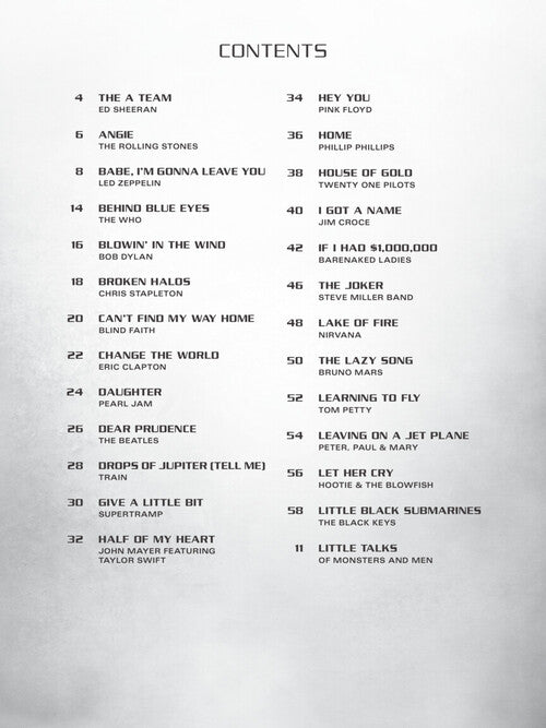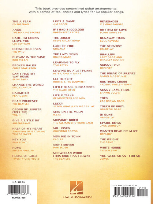 Simple Acoustic Songs The Easiest Easy Guitar Songbook Ever Publisher: Hal Leonard Category: Guitar, Bass & Fretted Series: Guitar Collection Format: Softcover Guitar Tab: YES A great songbook for new players featuring streamlined guitar arrangements, with a combo of tab, chords, and lyrics for 50 favorites: Angie · Blowin' in the Wind · Change the World · House of Gold · The Joker · Learning to Fly · Leaving on a Jet Plane · Little Talks · Man on the Moon · Mr. Jones · New Kid in Town · Norwegian Wood (This Bird Has Flown) · The Scientist · The Sound of Silence · Southern Cross · Toes · The Weight · You Were Meant for Me · and more. Includes tab, chords and lyrics for all songs. Listen to a Spotify playlist of all the songs from this book! (https://open.spotify.com/playlist/7aAFaGEFaJrQ9aF3sfqQw2) Inventory # : 00287458 UPC: 888680904166 ISBN: 1540043010 Width: 9" Length: 12" Height: 0.328" Product Weight: 0.9 lbs. Number of Pages: 112