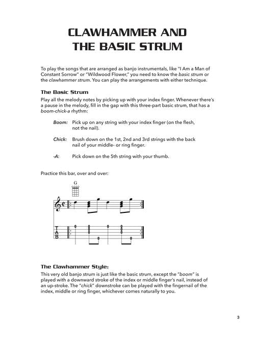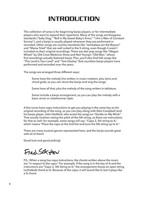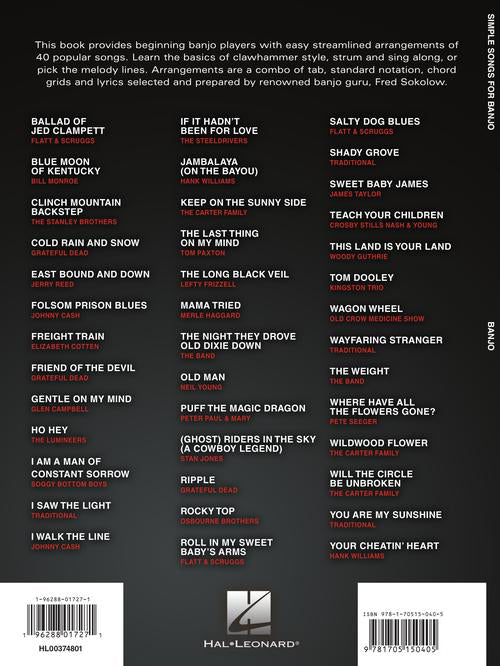 This book provides beginning banjo players with easy streamlined arrangements of 4 popular songs. Learn the basics of clawhammer style, strum and sing along, or pick the melody lines. Arrangements are a combo of tab, standard notation, chord grids and lyrics selected and prepared by renowned banjo guru, Fred Sokolow. Songs include: Ballad of Jed Clampett (Flatt & Scruggs) · Blue Moon of Kentucky (Bill Monroe) · Cold Rain and Snow (Grateful Dead)· Folsom Prison Blues (Johnny Cash) · Freight Train (Elizabeth Cotten) · Friend of the Devil (Grateful Dead) · Gentle on My Mind (Glen Campbell) · Ho Hey (The Lumineers) · I Am a Man of Constant Sorrow (Soggy Bottom Boys) · I Saw the Light (Traditional) · I Walk the Line (Johnny Cash) · Jambalaya (On the Bayou) (Hank Williams) · The Long Black Veil (Lefty Frizzell) · Mama Tried (Merle Haggard) · The Night They Drove Old Dixie Down (The Band) · Puff the Magic Dragon (Peter Paul & Mary) · (Ghost) Riders in the Sky (A Cowboy Legend) (Stan Jones) · Rocky Top (Osbourne Brothers) · Roll in My Sweet Baby's Arms (Flatt & Scruggs) · Sweet Baby James (James Taylor) · Teach Your Children (Crosby Stills Nash & Young) · This Land Is Your Land (Woody Guthrie) · Tom Dooley (Kingston Trio) · The Weight (The Band) · Where Have All the Flowers Gone? (Pete Seeger) · Will the Circle Be Unbroken (The Carter Family) · You Are My Sunshine (Traditional) · and more.