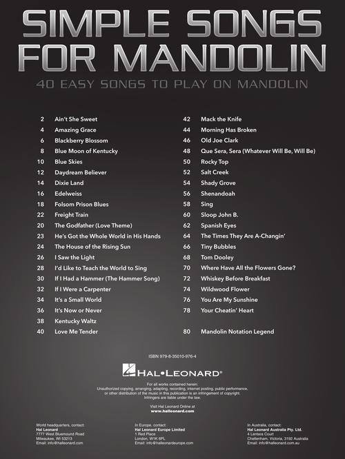 This book provides beginning mandolin players with easy streamlined arrangements of 40 must-know fiddle tunes, bluegrass standards, traditional American folksongs, pop songs, country songs, spirituals, Italian songs, and more. Written in standard notation with tab and chord frames and lyrics! Songs include: Ain't She Sweet · Amazing Grace · Blackberry Blossom · Blue Moon of Kentucky · Blue Skies · Daydream Believer · Dixie Land · Folsom Prison Blues · It's Now or Never · Morning Has Broken · Salt Creek · Tom Dooley · Wildwood Flower · You Are My Sunshine · and more!