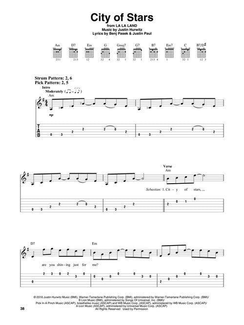 Movie musical lovers will delight in this songbook chock full of top-notch songs from blockbuster movies arranged for easy guitar with notes & tab. Includes: Audition (The Fools Who Dream) & City of Stars from La La Land · Evermore & How Does a Moment Last Forever from Beauty and the Beast · Fernando, Mamma Mia & Super Trouper from Mamma Mia: Here We Go Again · I Dreamed a Dream & Suddenly from Les Misérables · A Million Dreams & This Is Me from The Greatest Showman · It's the Hard-Knock Life & Tomorrow from Annie · plus 7 songs from the 2018 hit movie A Star Is Born featuring Lady Gaga and Bradley Cooper: Always Remember Us This Way, I'll Never Love Again, Is That Alright?, Look What I Found, Maybe It's Time, Music to My Eyes, and Shallow.
