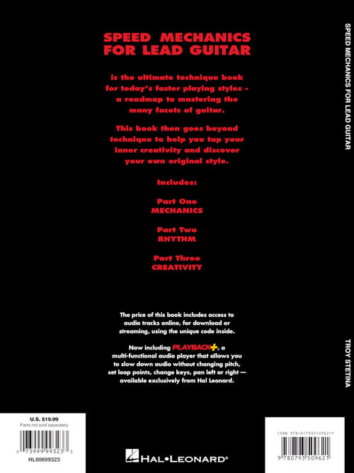 Take your playing to the stratosphere with the most advanced lead book by this proven heavy metal author. Speed Mechanics is the ultimate technique book for developing the kind of speed and precision in today's explosive playing styles. Learn the fastest ways to achieve speed and control, secrets to make your practice time really count, and how to open your ears and make your musical ideas more solid and tangible. Packed with over 200 vicious exercises including Troy's scorching version of Flight of the Bumblebee. Music and examples demonstrated in included online audio. The audio is accessed online using the unique code inside each book and can be streamed or downloaded. The audio files include PLAYBACK+, a multi-functional audio player that allows you to slow down audio without changing pitch, set loop points, change keys, and pan left or right.