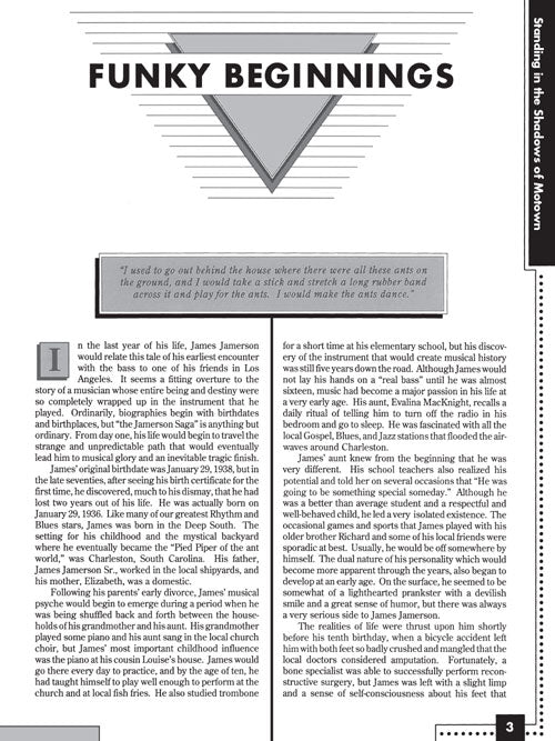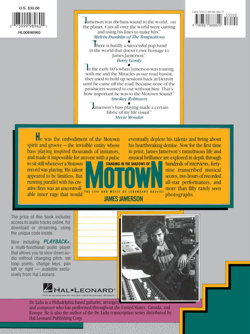 Bassist James Jamerson was the embodiment of the Motown spirit and groove - the invisible entity whose playing inspired thousands. His tumultuous life and musical brilliance are explored in depth through hundreds of interviews, 49 transcribed musical scores, two hours of recorded all-star performances, and more than 50 rarely seen photos in this stellar tribute to behind-the-scenes Motown. Features access to 120-minutes of audio! Allan Slutsky's 2002 documentary of the same name is the winner of the New York Film Critics Best Documentary of the Year award! Songs include: Ain't No Mountain High Enough · Ain't Nothing like the Real Thing · Ain't That Peculiar · Bernadette · Come 'Round Here (I'm the One You Need) · Darling Dear · Don't Mess with Bill · For Once in My Life · Home Cookin' · How Long Has That Evening Train Been Gone · How Sweet It Is (To Be Loved By You) · I Heard It Through the Grapevine · I Was Made to Love Her · I'm Gonna Make You Love Me · My Guy · Nowhere to Run · Reach Out I'll Be There · What's Going On · You Can't Hurry Love · and many more excerpts and riffs. The audio is accessed online using the unique code inside each book and can be streamed or downloaded. The audio files include PLAYBACK+, a multi-functional audio player that allows you to slow down audio without changing pitch, set loop points, change keys, and pan left or right.