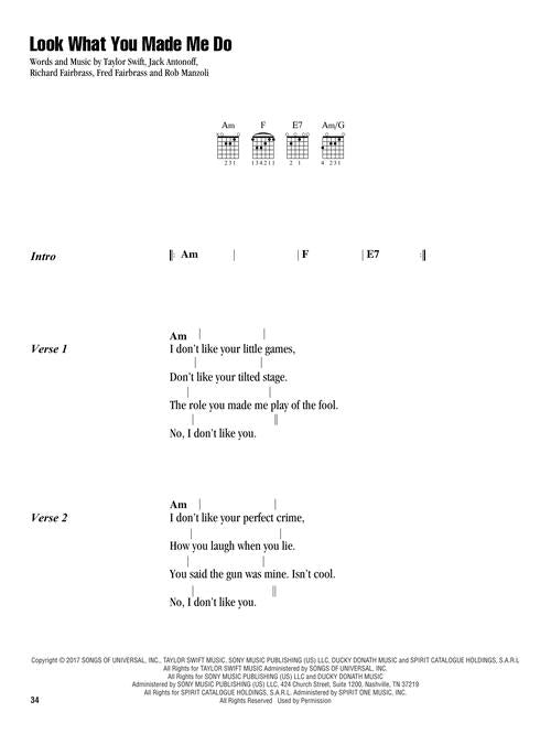 This great collection will have you strumming and singing your favorite Taylor songs in no time! It includes lyrics, chord symbols, and guitar chord frames for 18 of her biggest hits: All Too Well · Anti-Hero · Back to December · Blank Space · Cardigan · Exile · Fearless · I Knew You Were Trouble · Look What You Made Me Do · Love Story · Mean · Our Song · Shake It Off · Sweet Nothing · Teardrops on My Guitar · We Are Never Ever Getting Back Together · Willow · You Belong with Me.