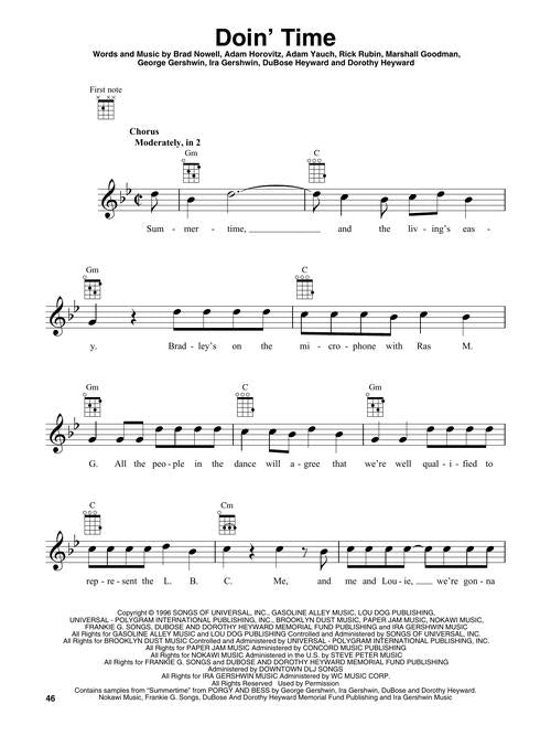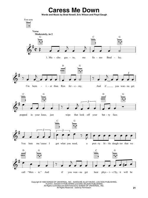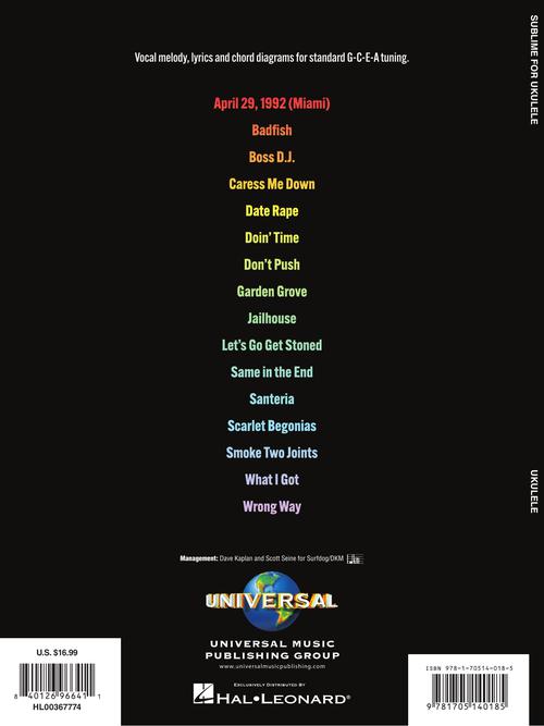 16 fan favorites arranged with vocal melody and chord diagrams for standard G-C-E-A tuning. Songs include: April 29, 1992 (Miami) · Badfish · Boss D.J. · Caress Me Down · Date Rape · Doin' Time · Don't Push · Garden Grove · Jailhouse · Let's Go Get Stoned · Same in the End · Santeria · Scarlet Begonias · Smoke Two Joints · What I Got · Wrong Way.