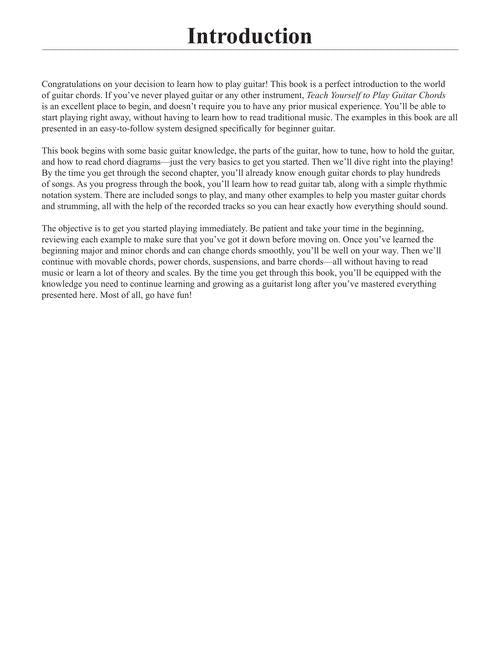 Teach Yourself to Play Guitar Chords was created specifically for beginning guitarists with no music-reading background. Topics covered include: open- and closed-position major and minor chords · rhythm and strumming patterns · power chords · suspensions and alterations · open seventh chords · barre chords · and much more. The book includes audio demonstration tracks online for download or streaming. Like the original guitar edition, this book features easy-to-interpret diagrams, photos and illustrations with complete, concise explanations, preparing the student for the option of further guitar instruction.