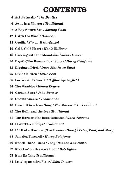 Play nearly 50 rock, folk, country & Christmas classics from the Beatles, Johnny Cash, DMB, John Denver, Jack Johnson and others - even if you know only 4 chords! Includes just the chords and lyrics for: Cecilia · Cold, Cold Heart · Day-O (The Banana Boat Song) · Dixie Chicken · The Gambler · Guantanamera · Leaving on a Jet Plane · My Generation · Ode to Billy Joe · Ring of Fire · Teach Your Children · Twist and Shout · Will the Circle Be Unbroken · and more.
