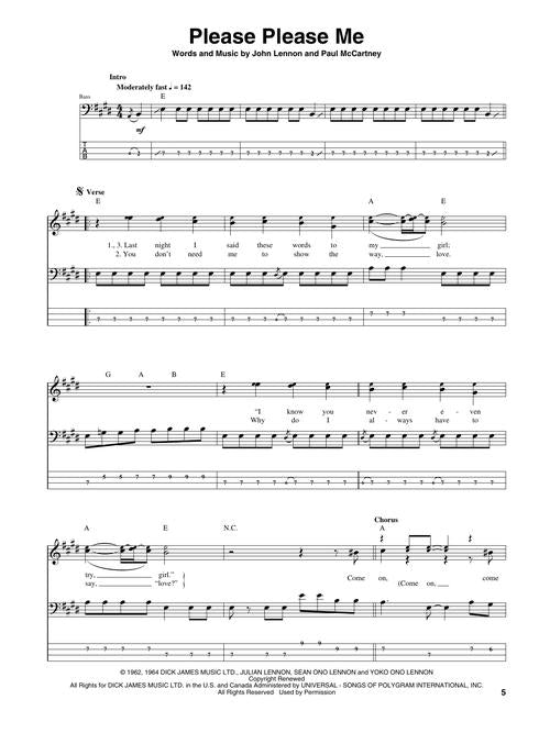 26 basslines from The Beatles' early hits transcribed note-for-note with tab, including: All My Loving · And I Love Her · Can't Buy Me Love · Drive My Car · Eight Days a Week · Eleanor Rigby · From Me to You · Girl · A Hard Day's Night · Help! · I Want to Hold Your Hand · Michelle · Nowhere Man · Paperback Writer · She Loves You · Ticket to Ride · We Can Work It Out · Yellow Submarine · Yesterday · and more.