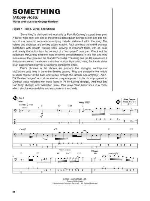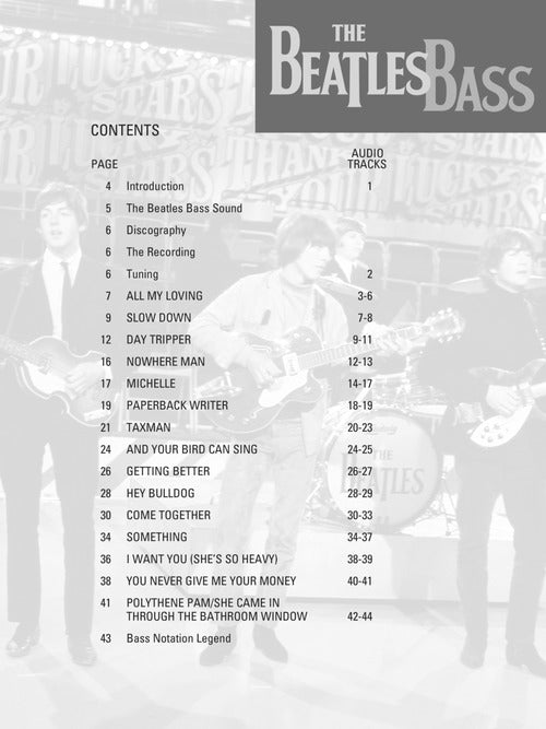 Learn the trademark bass lines from rock's most influential band! This step-by-step breakdown of Paul McCartney's bass guitar style includes in-depth analysis of 16 Beatles' classics: All My Loving · And Your Bird Can Sing · Come Together · Day Tripper · Getting Better · Hey Bulldog · I Want You (She's So Heavy) · Michelle · Nowhere Man · Paperback Writer · Polythene Pam · She Came in Through the Bathroom Window · Slow Down · Something · Taxman · You Never Give Me Your Money. The price of this book includes a unique code that provides access to audio tracks online, for download or streaming. The tracks include PLAYBACK+, a multi-functional audio player that allows you to slow down audio without changing pitch, set loop points, change keys, and pan left or right - available exclusively from Hal Leonard.