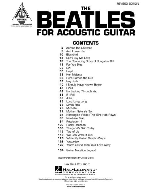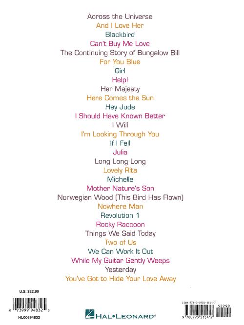 25 of The Beatles' best songs transcribed for acoustic guitar with tablature. Includes: Across the Universe · And I Love Her · Blackbird · Girl · Help! · Here Comes the Sun · Hey Jude · I Should Have Known Better · If I Fell · Michelle · Norwegian Wood · Nowhere Man · Rocky Raccoon · Things We Said Today · We Can Work It Out · Yesterday · and more.