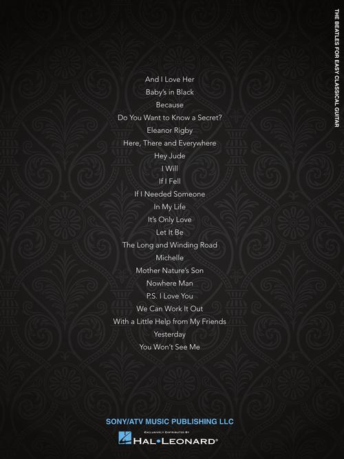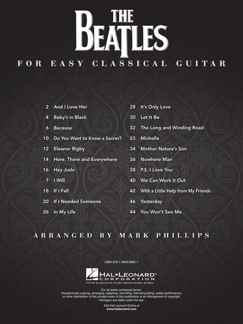 22 songs from the Fab Four carefully arranged in standard notation and tablature, including: And I Love Her · Eleanor Rigby · Hey Jude · In My Life · Let It Be · Michelle · We Can Work It Out · Yesterday · and more.