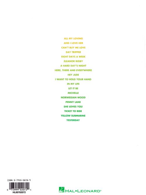 19 songs in EZ-Play notation to be played solo or as a duet. Songs: All My Loving · And I Love Her · Can't Buy Me Love · Day Tripper · Eight Days a Week · Eleanor Rigby · A Hard Day's Night · Here, There and Everywhere · Hey Jude · I Want to Hold Your Hand · In My Life · Let It Be · Michelle · Norwegian Wood (This Bird Has Flown) · Penny Lane · She Loves You · Ticket to Ride · Yellow Submarine · Yesterday.