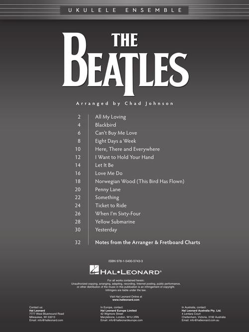 The songs in this collection are playable by any combination of ukuleles (soprano, concert, tenor or baritone). Each arrangement features the melody, a harmony part, and a bass line. Chord symbols are also provided if you wish to add a rhythm part. For groups with more than three or four ukuleles, the parts may be doubled. This volume includes 15 Beatles favorites, including: All My Loving · Blackbird · Can't Buy Me Love · Eight Days a Week · Here, There and Everywhere · I Want to Hold Your Hand · Let It Be · Love Me Do · Norwegian Wood (This Bird Has Flown) · Penny Lane · Something · Ticket to Ride · When I'm Sixty-Four · Yellow Submarine · Yesterday.