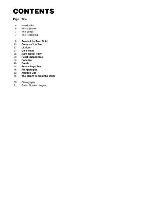 As the heroes of a new musical generation, Nirvana's influence can't be overestimated. This book/online audio pack lets you inside the playing of grunge god Kurt Cobain, teaching his riffs and licks that defined alternative music. Includes an introduction, detailed notes on Cobain's guitars, amps & effects, a discography, and these 12 Nirvana classics: About a Girl · All Apologies · Come as You Are · Dumb · Heart Shaped Box · Lithium · The Man Who Sold the World · On a Plain · Penny Royal Tea · (New Wave) Polly · Rape Me · Smells like Teen Spirit. Audio is accessed online using the unique code inside the book and can be streamed or downloaded. The audio files include PLAYBACK+, a multi-functional audio player that allows you to slow down audio without changing pitch, set loop points, change keys, and pan left or right.