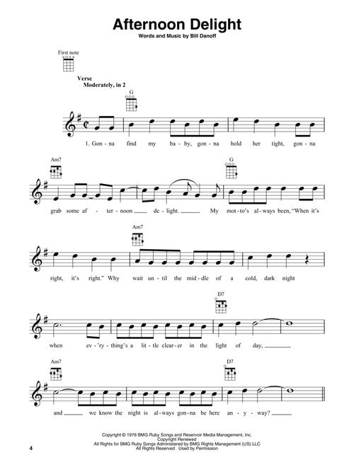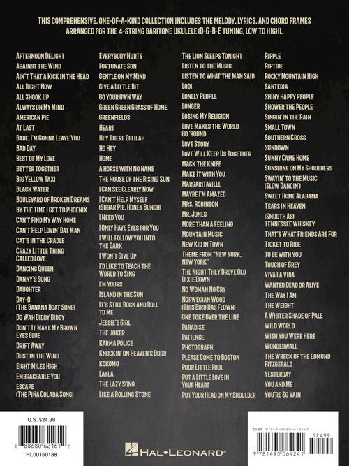 Arranged for the 4-string baritone uke (D-G-B-E tuning, low to high), this comprehensive collection includes the melody, lyrics and chord frames to 125 songs, including: American Pie · Big Yellow Taxi · Crazy Little Thing Called Love · Drift Away · Everybody Hurts · Go Your Own Way · Ho Hey · I'm Yours · Kokomo · The Lazy Song · Margaritaville · No Woman No Cry · Riptide · Sweet Home Alabama · Tears in Heaven · Viva La Vida · Yesterday · and more. 398 pages!