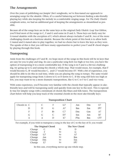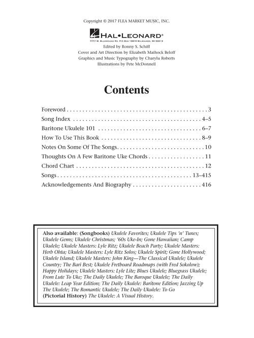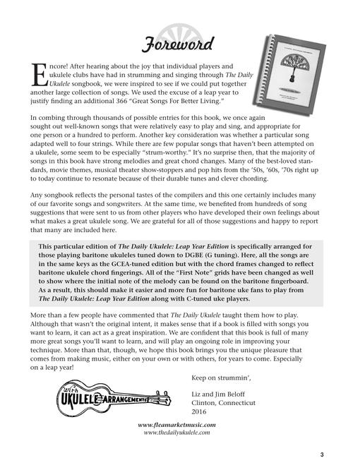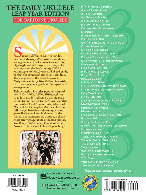 Now baritone ukulele players can enjoy the Daily Ukulele: Leap Year Edition songbook. This super collection features all the same songs from the Leap Year Edition in the original keys but with baritone ukulele chord grids (DGBE tuning). Have fun strumming 366 well-known songs from the 1950s through today, by artists such as Carole King, Elton John, the Bee Gees, Stevie Wonder, the Beatles, Paul Simon, Bob Dylan, Michael Jackson and others, plus favorites from movies, Broadway, Motown and more. Like all of the Daily Ukulele songbooks, the arrangements feature melody, lyrics and ukulele chord grids in uke-friendly keys. A special Ukulele 101 section, a chord chart, and vintage ukulele-themed photos round out the fun, all with a spiral binding for ease of use. Tunes include: Ain't No Sunshine · Anticipation · Bubbly · Calendar Girl · Come Monday · Falling Slowly · Hallelujah · I Got You Babe · Lean On Me · Moondance · Route 66 · Sweet Caroline · We Are the World · Y.M.C.A. · and scores more! The Daily Ukulele: Leap Year Edition for Baritone Ukulele offers ukulele fun all year long - even on February 29th!