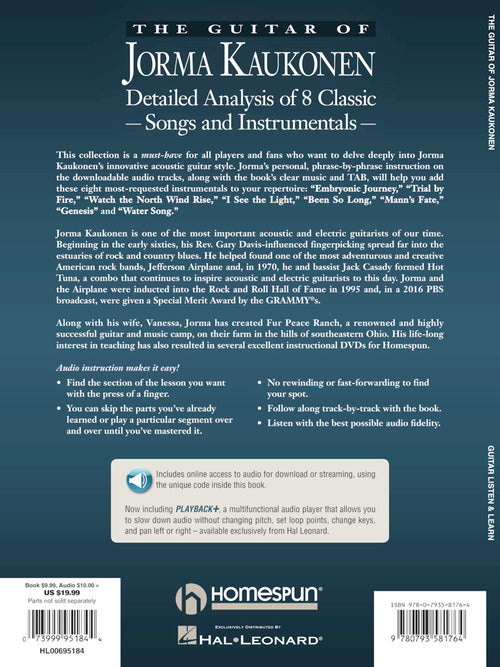 The renowned guitarist for Jefferson Airplane and Hot Tuna teaches eight of his classic songs and instrumentals. He performs each piece, then breaks them down in detail for the benefit of learning guitarists. Jorma has an avid following, and this product will create great excitement among his many fans! Songs: Embryonic Journey · Trial by Fire · Watch the North Wind Rise · I See the Light · Been So Long · Mann's Fate · Genesis · Water Song. The audio is accessed online using the unique code inside each book and can be streamed or downloaded. The audio files include PLAYBACK+, a multi-functional audio player that allows you to slow down audio without changing pitch, set loop points, change keys, and pan left or right.
