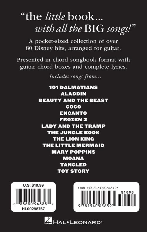 The little book with all the BIG songs! This pocket-sized collection features nearly 90 Disney hits arranged for guitar. Presented in chord songbook format with guitar chord boxes and complete lyrics. Includes: Be Our Guest · Beauty and the Beast · Breaking Free · Can You Feel the Love Tonight · The Climb · Do You Want to Build a Snowman? · Evermore · Friend like Me · Hakuna Matata · How Far I'll Go · I See the Light · I'll Make a Man Out of You · Into the Unknown · Lava · Let It Go · The Place Where Lost Things Go · Reflection · Remember Me (Ernesto de la Cruz) · A Spoonful of Sugar · Supercalifragilisticexpialidocious · True Love's Kiss · Under the Sea · We Belong Together · We Don't Talk About Bruno · When Will My Life Begin? · A Whole New World · You're Welcome · You've Got a Friend in Me · and more.