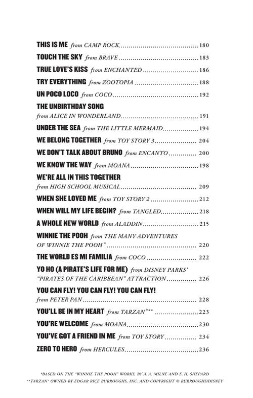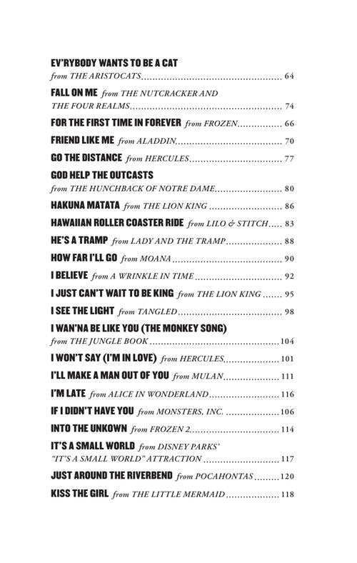 This classy little collection packs a big punch with complete lyrics and chords for nearly 90 Disney favorites! Presented in chord songbook format with ukulele chord boxes and complete lyrics. Includes songs from Disney's entire catalog, from 101 Dalmatians and Mary Poppins to Encanto and Moana! Songs include: Almost There · Be Our Guest · Breaking Free · Can You Feel the Love Tonight · Chim Chim Cher-ee · Colors of the Wind · Do You Want to Build a Snowman? · Evermore · Hakuna Matata · How Far I'll Go · I See the Light · I'm Late · Into the Unknown · Let It Go · Reflection · Remember Me (Ernesto de la Cruz) · A Spoonful of Sugar · Strong · Supercalifragilisticexpialidocious · That's How You Know · Touch the Sky · Under the Sea · We Don't Talk About Bruno · When She Loved Me · A Whole New World · The World Es Mi Familia · You've Got a Friend in Me · and more.