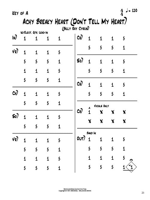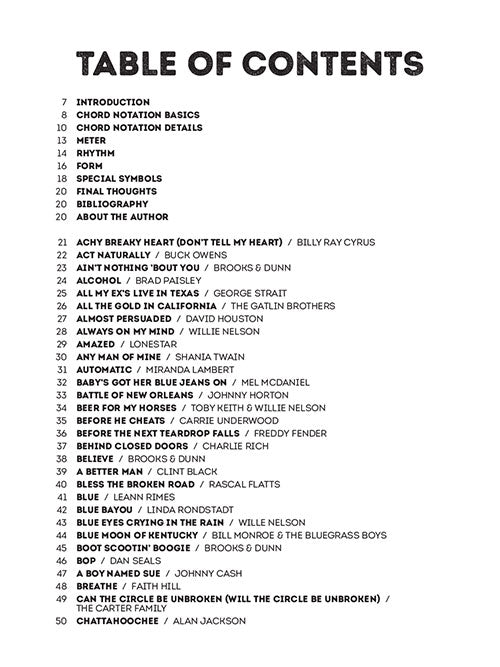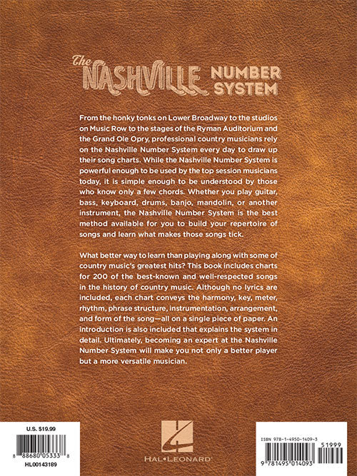 The Nashville Number System is the standard way for a professional country musician to notate a song. The system has been around since the 1950s, and it rapidly became widespread within the country music community because of how efficiently it can represent music. In essence, a Nashville number chart conveys the harmony, key, meter, rhythm, phrase structure, instrumentation, arrangement, and form of a song - all on a single piece of paper. An introduction is included that thoroughly explains how to use the book. Lyrics are not included. This valuable resource gathers together 200 country standards from yesterday's favorites to today's chart-topping hits, including: Achy Breaky Heart (Don't Tell My Heart) · Act Naturally · All the Gold in California · Always on My Mind · Amazed · Battle of New Orleans · Before He Cheats · Before the Next Teardrop Falls · Behind Closed Doors · Bless the Broken Road · Blue Eyes Crying in the Rain · Boot Scootin' Boogie · A Boy Named Sue · Breathe · Coal Miner's Daughter · Could I Have This Dance · Crazy · The Dance · Delta Dawn · The Devil Went down to Georgia · Don't It Make My Brown Eyes Blue · Elvira · Folsom Prison Blues · Friends in Low Places · The Gambler · God Bless the U.S.A. · He Stopped Loving Her Today · Hey, Good Lookin' · I Hope You Dance · I Walk the Line · I Will Always Love You · In Color · Jesus Take the Wheel · King of the Road · Live like You Were Dying · The Long Black Veil · Lucille · Luckenbach, Texas (Back to the Basics of Love) · Mean · Need You Now · On the Road Again · Redneck Woman · Springsteen · Stand by Your Man · This Kiss · You're Still the One · Your Cheatin' Heart · and more! Spiral bound.
