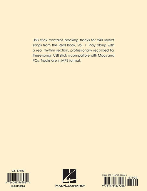 The Real Book - Volume 1 Book/USB Flash Drive Pack Publisher: Hal Leonard Category: Guitar, Bass & Fretted Series: Real Book Play-Along Format: Softcover with USB The Real Book you know and love has now been updated to include backing tracks for 240 songs on one convenient USB flash drive stick! The play-along CDs alone are worth $100 so this is an amazing package price! The Real Books are the best-selling jazz books of all time. Since the 1970s, musicians have trusted these volumes to get them through every gig, night after night. The problem is that the books were illegally produced and distributed without any reqard to copyright law or royalties paide to the composers who created these musical masterpieces. Hal Leonard is very proud to present the first legitimate and legal editions of these books ever produced. You won't even notice the difference, other than that all of the notorious errors have been fixed! Looking for a particular song? Check out the Real Book Songfinder (http://www.halleonard.com/bin/MiscRealbksongfind2016.pdf) here. Inventory # : 00110604 UPC: 884088863982 ISBN: 1476877262 Width: 8.5" Length: 11" Height: 1.081" Product Weight: 3.1 lbs. Number of Pages: 464