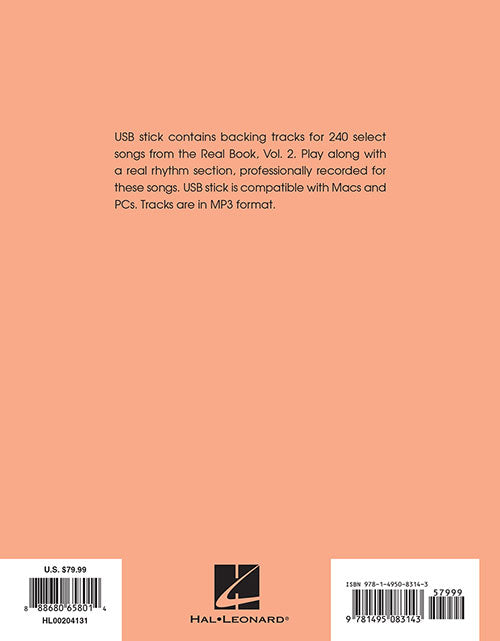 The Real Book - Volume 2 - Second Edition C Edition Book/USB Flash Drive Pack Publisher: Hal Leonard Category: Guitar, Bass & Fretted Series: Real Book Play-Along Format: Softcover with USB The Real Book you know and love has now been updated to include backing tracks for 240 songs on one convenient USB flash drive stick! The four play-along CDs cost a combined $100 so this is an amazing package price! The Real Books are the best-selling jazz books of all time. Since the 1970s, musicians have trusted these volumes to get them through every gig, night after night. This package includes the complete book for the second edition of the C instrument Volume 2 book, as well as a USB stick for backing tracks matching arrangements in the book. Now you can play along with a real rhythm section, professionally recorded for these songs. The USB stick is compatible with Macs and PCs, with the tracks in MP3 format. Looking for a particular song? Check out the Real Book Songfinder (http://www.halleonard.com/bin/MiscRealbksongfind2016.pdf) here. Inventory # : 00204131 UPC: 888680658014 ISBN: 1495083144 Width: 8.5" Length: 11" Height: 0.891" Product Weight: 2.4 lbs. Number of Pages: 440