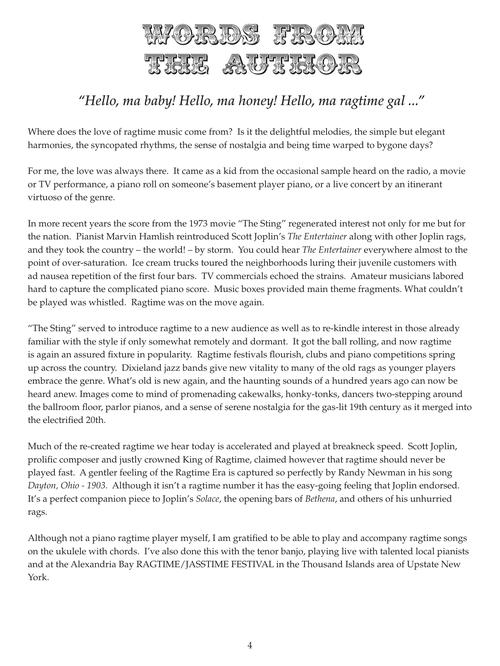 Dick Sheridan has compiled essential themes for ten classic rags that sound great on ukulele. These arrangements will work for soprano, concert, and tenor ukuleles in both C and low G tunings and for baritone ukes in standard tuning. You'll be able to play along with melodies and accompaniment chords thanks to the great recordings that are accessed online. The book includes a complete score for The Entertainer plus themes for: At a Georgia Campmeeting · The Cascades · Crab Apples · Creole Belles · Dill Pickles · Dusty Rag · The Easy Winners · Maple Leaf Rag · Sensation · Swipesy Cakewalk. This wonderful collection provides nostalgic, elegant, uniquely entertaining, and endless fun!
