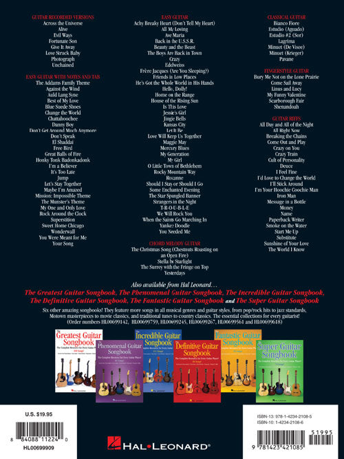 A top-notch resource for every guitarist, this 111-song collection assembles songs in all musical genres and guitar styles. Contains everything from pop/rock hits to jazz standards, Motown masterpieces to movie classics, traditional tunes, country favorites, Broadway blockbusters and beyond! Features note-for-note transcriptions (Evil Ways · Give It Away · Photograph), riffs (All Right Now · Deuce · Iron Man · Start Me Up), and arrangements for easy guitar (Change the World · Crazy · Jump · Roxanne), chord melody (The Christmas Song · Stella by Starlight · Yesterdays), fingerstyle (Come Sail Away · Linus & Lucy · My Funny Valentine), classical (Lagrima · Minuet · Pavane), and more!