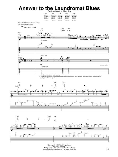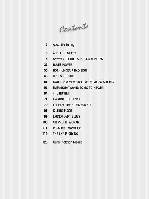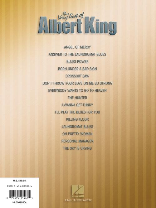 Albert King was one of the greatest and most important guitarists of all time. He not only changed the blues world, but also influenced most modern guitar playing - whether today's players realize it or not! This collection assembles 15 of his finest pieces transcribed note-for-note with tab. Includes: Angel of Mercy · Blues Power · Born Under a Bad Sign · Crosscut Saw · Don't Throw Your Love on Me So Strong · The Hunter · I Wanna Get Funky · Killing Floor · Laundromat Blues · Oh Pretty Woman · The Sky Is Crying · and more.