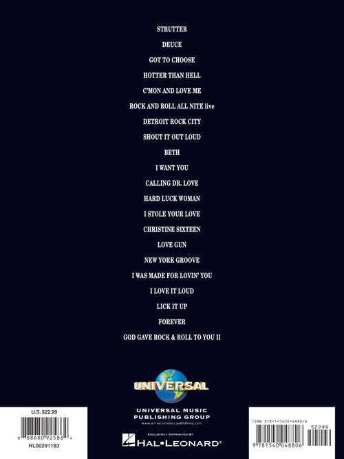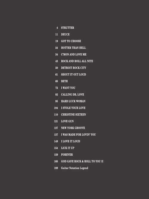 This matching folio features 21 of the most time-tested hits of this legendary heavy metal band in authentic transcriptions for guitar with notes and tab. Songs include: Beth · Calling Dr. Love · Christine Sixteen · C'mon and Love Me · Detroit Rock City · Deuce · Forever · God Gave Rock & Roll to You II · Got to Choose · Hard Luck Woman · Hotter Than Hell · I Love It Loud · I Stole Your Love · I Want You · I Was Made for Lovin' You · Lick It Up · Love Gun · New York Groove · Rock and Roll All Nite · Shout It Out Loud · Strutter.