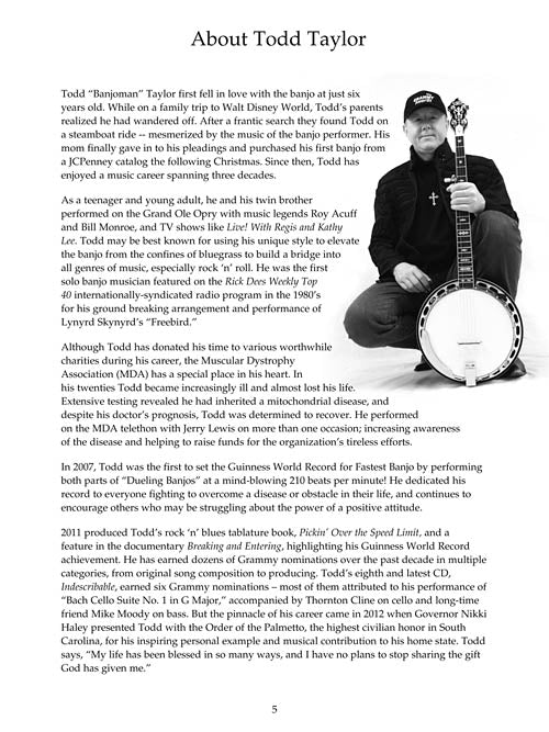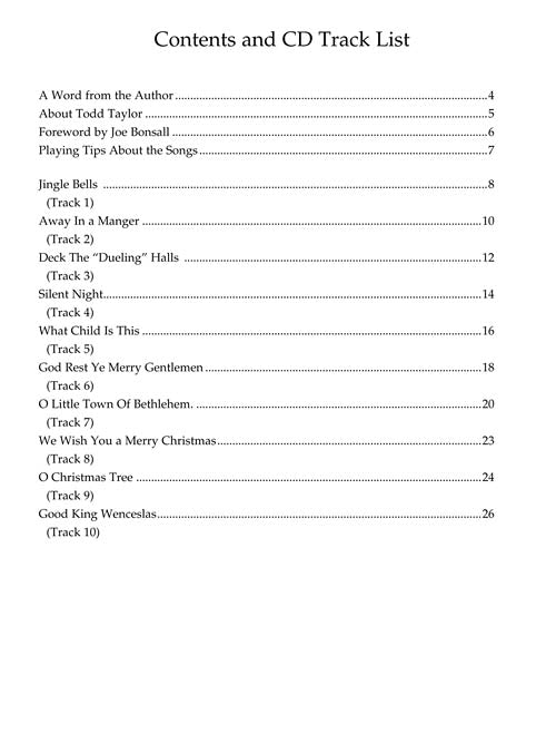 Ten Christmas favorites are presented in exciting arrangements by banjo virtuoso Todd Taylor in this collection which is both challenging and fun to play. The music is arranged at an intermediate to advanced level and is in standard G tuning. Includes a CD so you can listen to hear how the banjo should sound and then play along with the note-for-note tablature provided for each song.