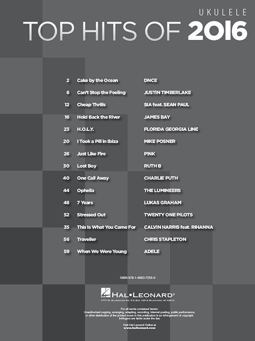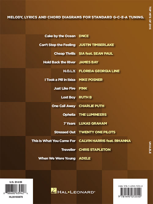 15 of the most popular songs of the year arranged for the uke, including: Cake by the Ocean · Can't Stop the Feeling · Cheap Thrills · H.O.L.Y. · I Took a Pill in Ibiza · Just like Fire · Lost Boy · One Call Away · 7 Years · Stressed Out · When We Were Young · and more.