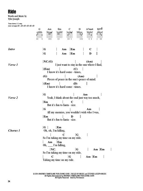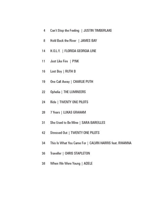 Lyrics, chord symbols and guitar chord frames for 14 of the year's hottest hits are presented in this collection. Includes: Can't Stop the Feeling (Justin Timberlake) · H.O.L.Y. (Florida Georgia Line) · Just Like Fire (P!nk) · Lost Boy (Ruth B) · One Call Away (Charlie Puth) · 7 Years (Lukas Graham) · Stressed Out (Twenty One Pilots) · When We Were Young (Adele) · and more.