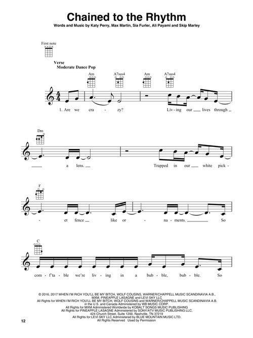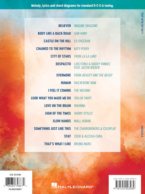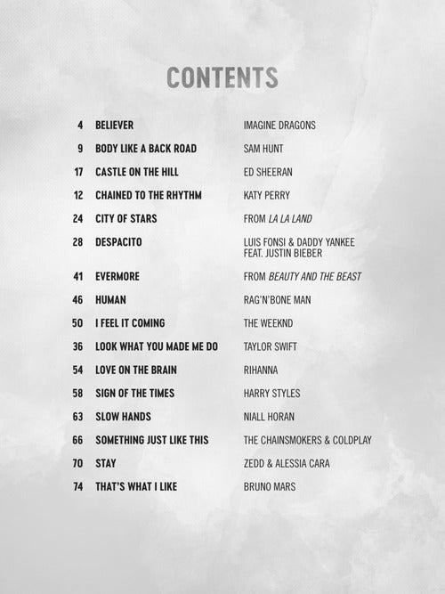 16 of the year's best arranged for ukulele, including: Believer · Castle on the Hill · City of Stars · Despacito · Evermore · Look What You Made Me Do · Love on the Brain · Sign of the Times · Stay · That's What I Like · and more.