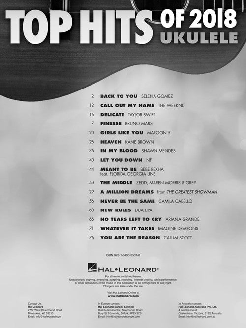 16 hot pop hits of the year presented for ukulele in melody, lyrics and chord diagrams, in standard G-C-E-A tuning. Songs include: Back to You (Selena Gomez) · Call Out My Name (The Weeknd) · Delicate (Taylor Swift) · Heaven (Kane Brown) · In My Blood (Shawn Mendes) · Let You Down (NF) · The Middle (Zedd, Maren Morris & Grey) · New Rules (Dua Lipa) · No Tears Left to Cry (Ariana Grande) · You Are the Reason (Calum Scott) · and more.