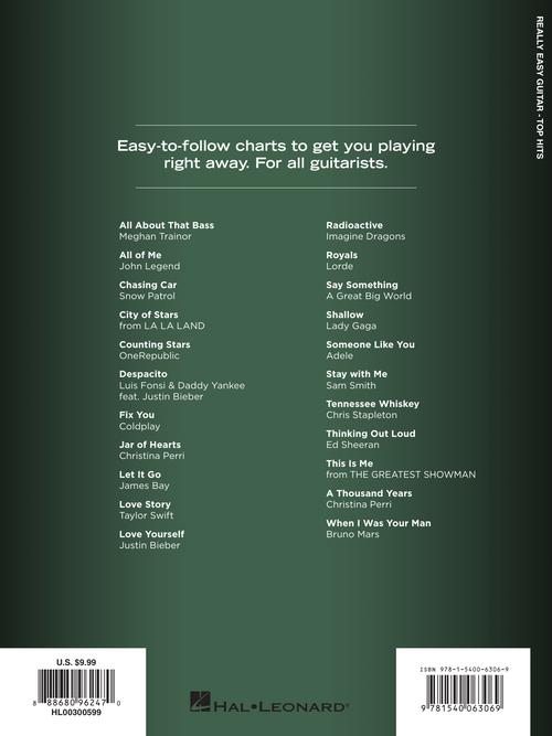 This songbook features easy-to-follow charts to get you playing right away! Each song is presented with chords, lyrics and basic tab to help even beginners play their favorite songs. This title features 22 hits, including: All About That Bass · All of Me · Despacito · Love Yourself · Royals · Say Something · Shallow · Someone like You · This Is Me · A Thousand Years · When I Was Your Man · and more.