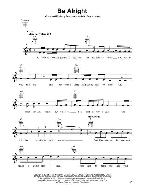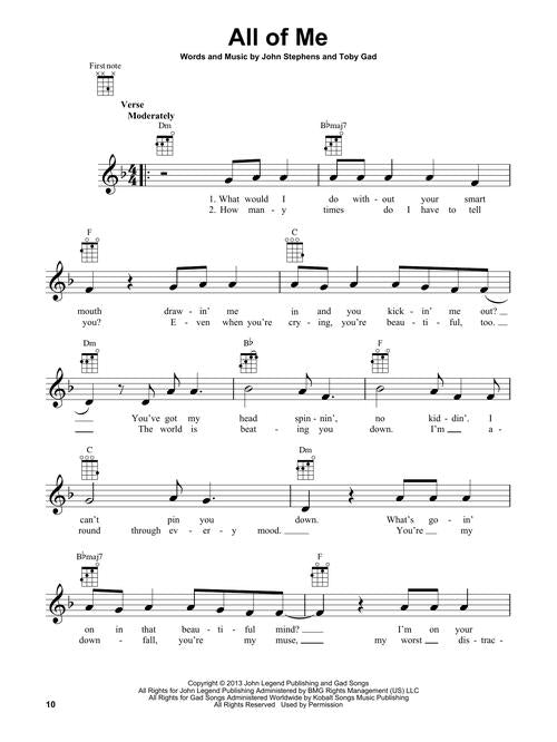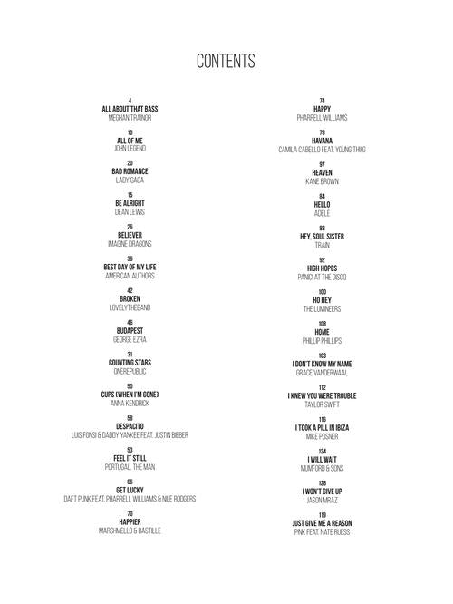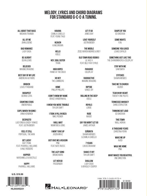 This 272-page collection lets you strum and sing along to 60 of the decade's top hits. Arrangements include melody, lyrics and chord diagrams for standard G-C-E-A ukulele tuning. Includes: All of Me (John Legend) · Believer (Imagine Dragons) · Despacito (Luis Fonsi & Daddy Yankee) · Get Lucky (Daft Punk) · Happy (Pharrell Williams) · Hey, Soul Sister (Train) · Ho Hey (The Lumineers) · I Will Wait (Mumford & Sons) · The Lazy Song (Bruno Mars) · Rolling in the Deep (Adele) · Shake It Off (Taylor Swift) · Shallow (Lady Gaga & Bradley Cooper) · Stay with Me (Sam Smith) · Thinking Out Loud (Ed Sheeran) · Wake Me Up (Avicii) · and more.