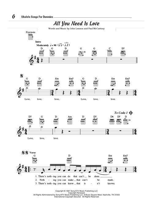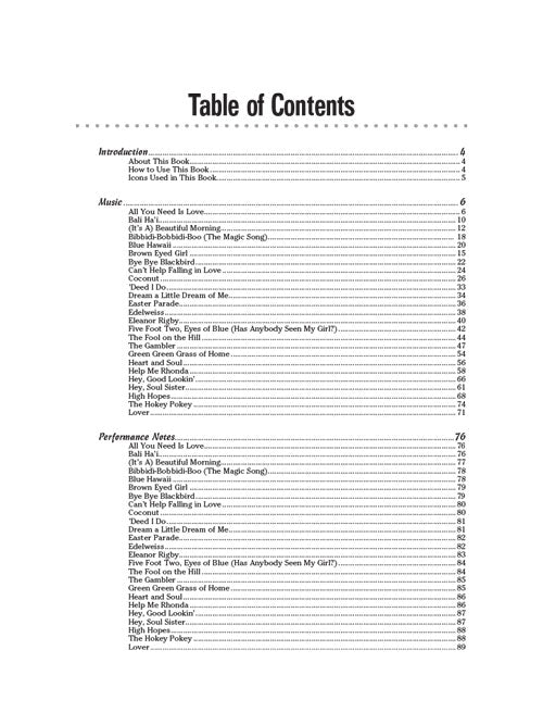 Want to learn to play a wide variety of songs on the ukulele? Then this is the right book for you! An easy-to-use resource for the casual hobbyist or working musician, this collection features 50 full songs with standard notation, ukulele tablature, lyrics, and helpful performance notes. Tunes include: All You Need Is Love · Can't Help Falling in Love · Edelweiss · The Gambler · Hey, Soul Sister · Mr. Tambourine Man · Puff the Magic Dragon · (Sittin' on) The Dock of the Bay · Still the One · Tiny Bubbles · You Are My Sunshine · and more.