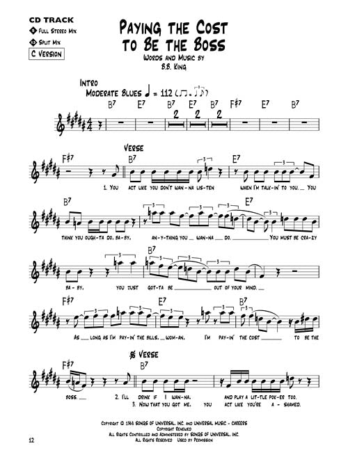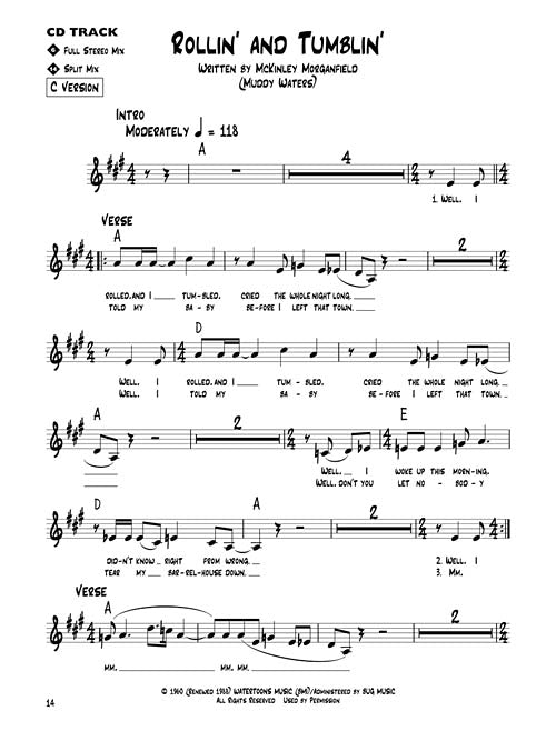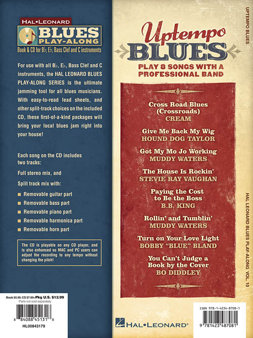 For use with all Bb, Eb, Bass Clef, and C instruments, the Hal Leonard Blues Play-Along Series is the ultimate jamming tool for all blues musicians. With easy-to-read lead sheets, and other split-track choices on the inlcuded CD, these first-of-a-kind packages will bring your local blues jam right into your house! Each song on the CD includes two tracks: a full stereo mix, and a split track mix with removable guitar, bass, piano, and harp parts. 8 songs: Cross Road Blues (Crossroads) · Give Me Back My Wig · Got My Mo Jo Working · The House Is Rockin' · Paying the Cost to Be the Boss · Rollin' and Tumblin' · Turn On Your Love Light · You Can't Judge a Book by the Cover.