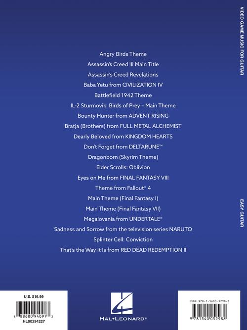 Themes from 20 favorite games arranged for easy guitar with notes and tab and guitar chord diagrams. Includes: Angry Birds · Assassin's Creed III · Bounty Hunter · Fallout® 4 · Final Fantasy VII · Spliter Cell: Conviction · and more.