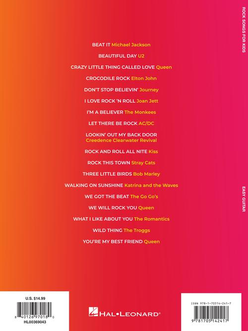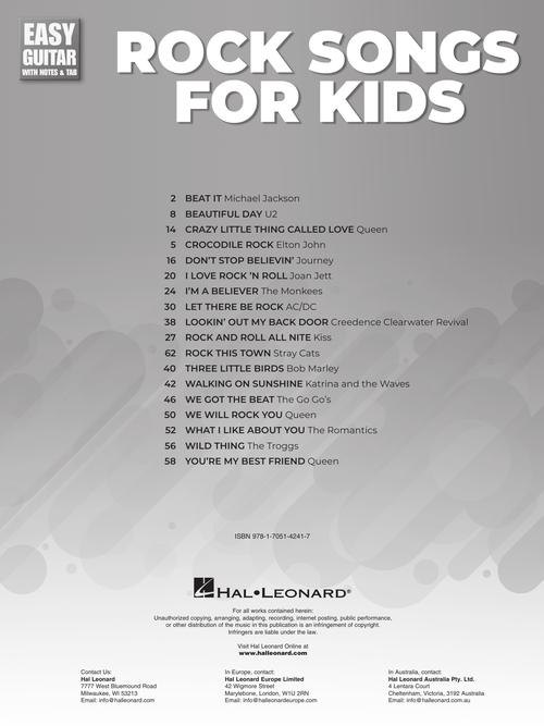 Rock Guitar Songs for KidsPublisher: Hal LeonardCategory: Guitar, Bass & FrettedSeries: Easy GuitarFormat: SoftcoverGuitar Tab: YESThis songbook features 18 rockin' favorites that kids love arranged in standard notation and tablature, including: Beat It ยท Crocodile Rock...Regular price $20.99 -