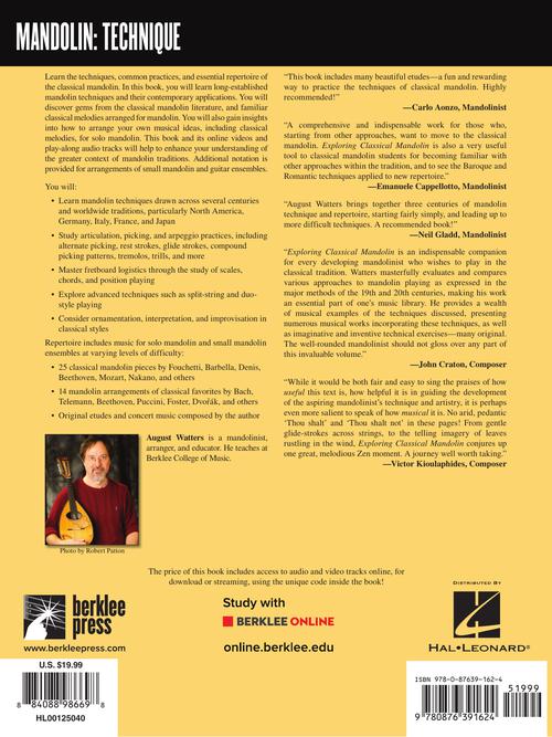 Author: August Watters Exploring Classical Mandolin Technique & Repertoire Softcover Media Online Named one of the Best Mandolin Books of All Time by BookAuthority.org! Learn the techniques, common practices, and essential repertoire of the classical mandolin....Regular price $29.99 -