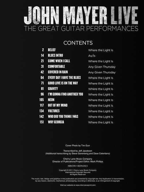 Artist: John Mayer John Mayer Live The Great Guitar Performances Publisher: Cherry Lane Music Category: Guitar, Bass & Fretted Series: Play It Like It Is Format: Softcover Guitar Tab: YES Here's a stand-out collection of 14...Regular price $33.99 -