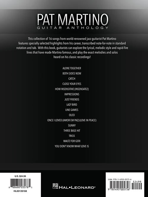 Pat Martino - Guitar AnthologyPublisher: Hal LeonardCategory: Guitar, Bass & FrettedSeries: Guitar Recorded VersionFormat: SoftcoverGuitar Tab: YESThis collection of 16 songs from world-renowned jazz guitarist Pat Martino features specially selected highlights from his career, transcribed note-for-note...Regular price $41.99 -