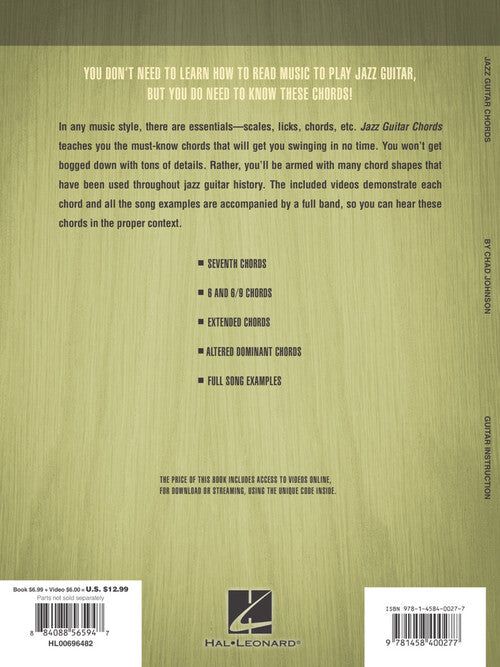 Author: Chad Johnson Jazz Guitar Chords Learn the Essential Chords You Need to Start Playing Jazz Now! Publisher: Hal Leonard Category: Guitar, Bass & Fretted Series: Guitar Educational Format: Softcover Video Online In any music style,...Regular price $17.99 -