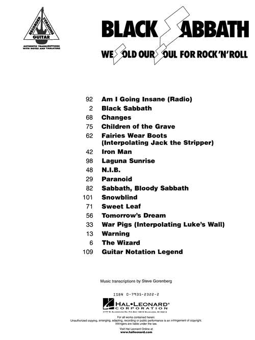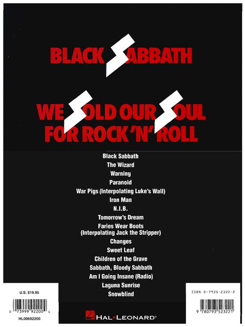 Black Sabbath - We Sold Our Soul for Rock 'n' Roll Revised Edition Publisher: Hal Leonard Category: Guitar, Bass & Fretted Series: Guitar Recorded Version Format: Paperback Guitar Tab: YES Guitar tab for 16 hard-rocking songs...Regular price $29.99 -