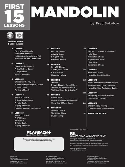 Author: Fred Sokolow First 15 Lessons - Mandolin A Beginner's Guide, Featuring Step-By-Step Lessons with Audio, Video, and Popular Songs! Publisher: Hal Leonard Category: Guitar, Bass & Fretted Series: Mandolin Format: Softcover Media Online Guitar Tab:...Regular price $15.99 -