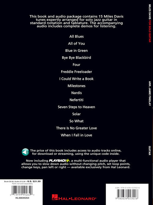 Artist: Miles Davis Miles Davis for Solo Guitar Publisher: Hal Leonard Category: Guitar, Bass & Fretted Series: Guitar Solo Format: Softcover Audio Online Guitar Tab: YES 15 jazzy solo guitar arrangements of Davis classics, including: All...Regular price $32.99 -